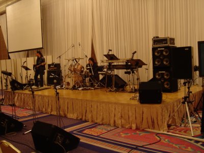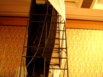 会場はW:50m.D:32m、イス席で2300人、もういっぱいです・・・入りきれません。 入りきれない人のために別会場でサウンドオフィスさんが中継しています。 左側の写真のジョーゼットで巻かれた物がタワーです。 |
